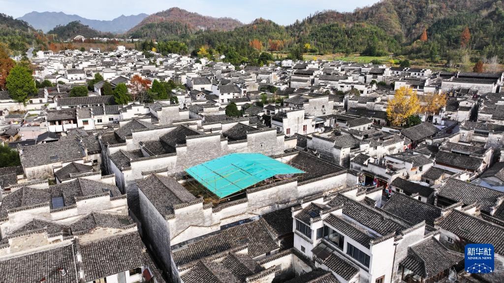 这是11月26日在黄山市黟县西递村拍摄的正在封闭维修中的追慕堂(无人机照片)。
