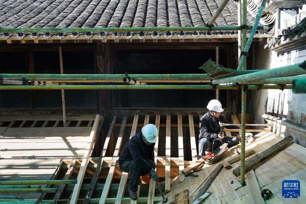 11月26日,维修工人在黄山市黟县西递村追慕堂对房屋进行修缮。