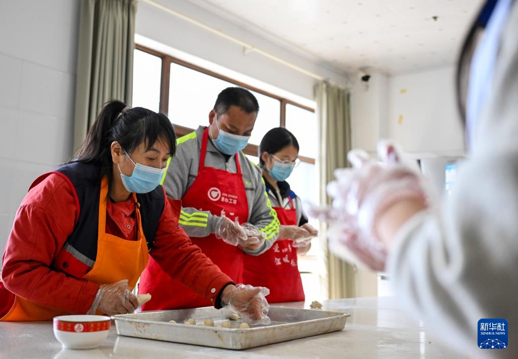 11月26日,学员在老师(左一)与志愿者(右一)的陪同下学习烘焙。