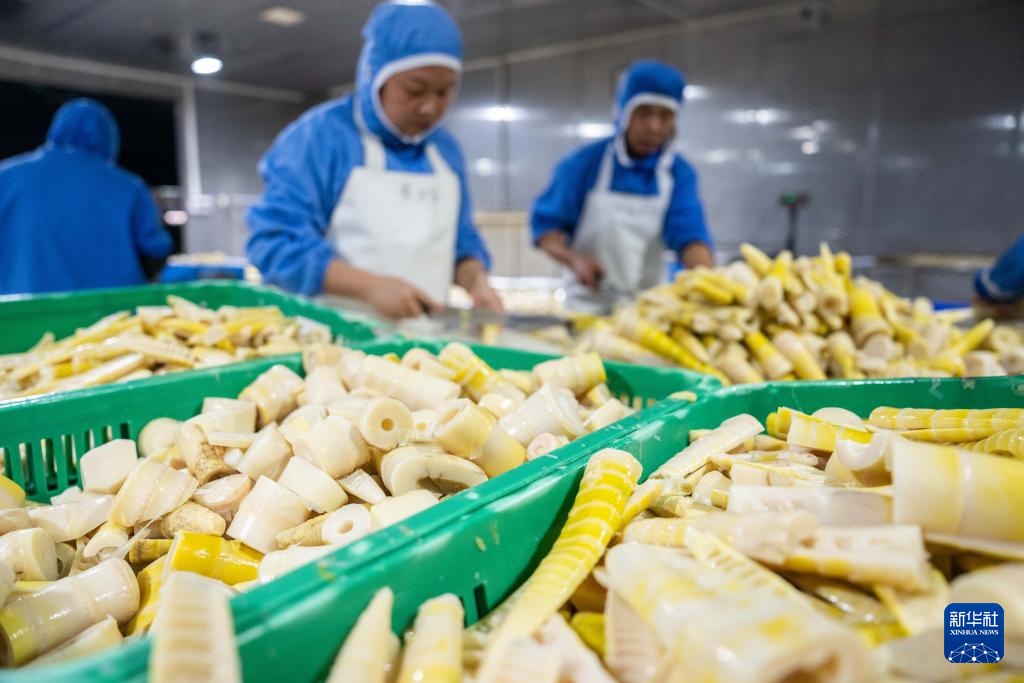11月27日,工人在桃江县马迹塘镇笋竹特色产业园内一家鲜笋加工企业生产车间加工鲜笋。