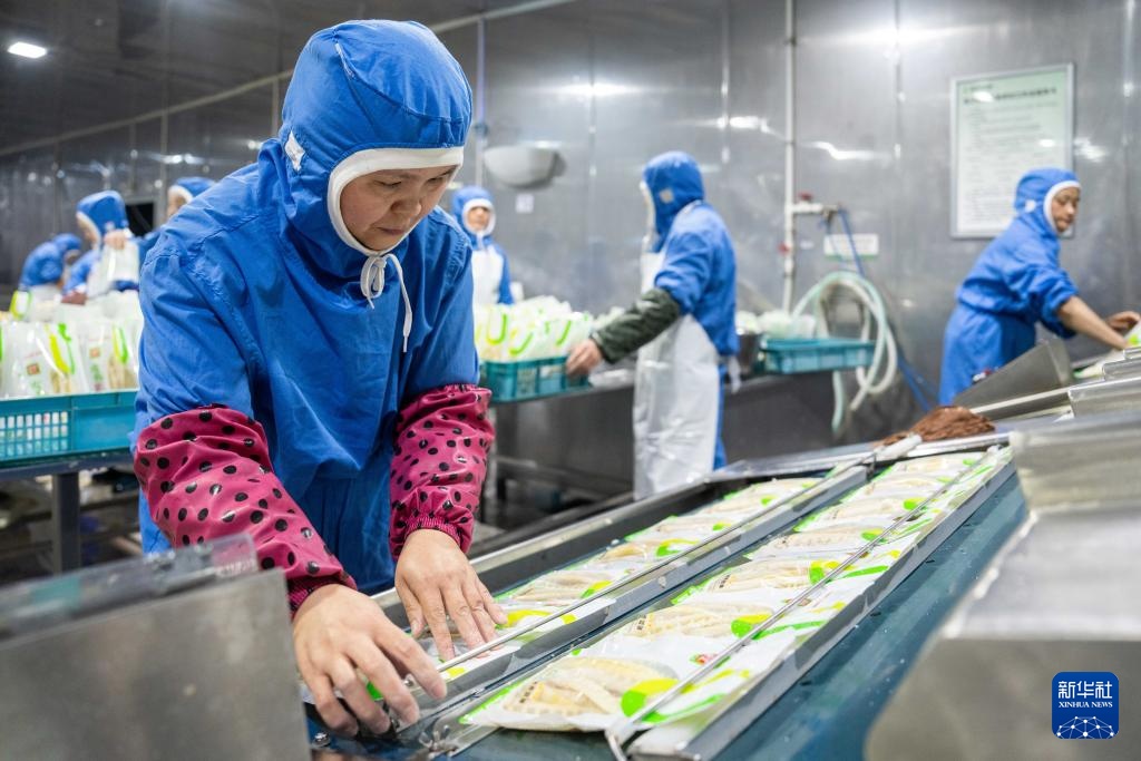 11月27日,在桃江县马迹塘镇笋竹特色产业园内一家鲜笋加工企业生产车间,工作人员在包装鲜笋。