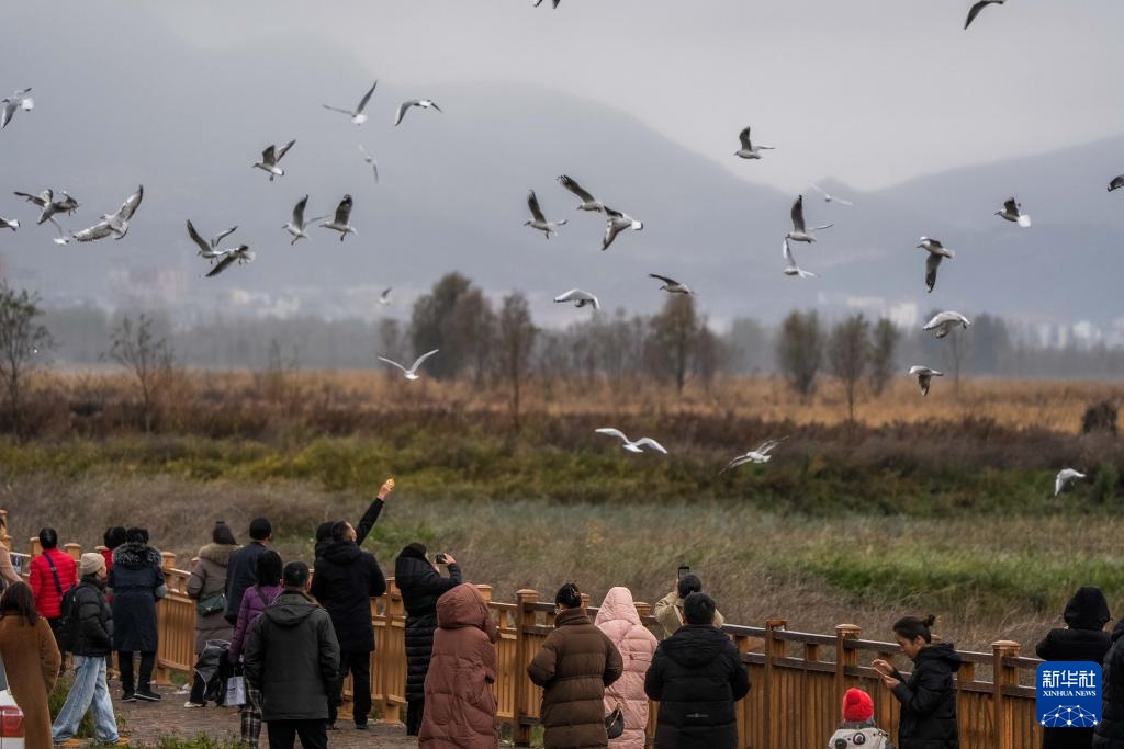 近日,大量红嘴鸥抵达位于贵州省毕节市威宁县的草海国家级自然保护区,开启越冬之旅,吸引游客和市民前来观鸟互动。