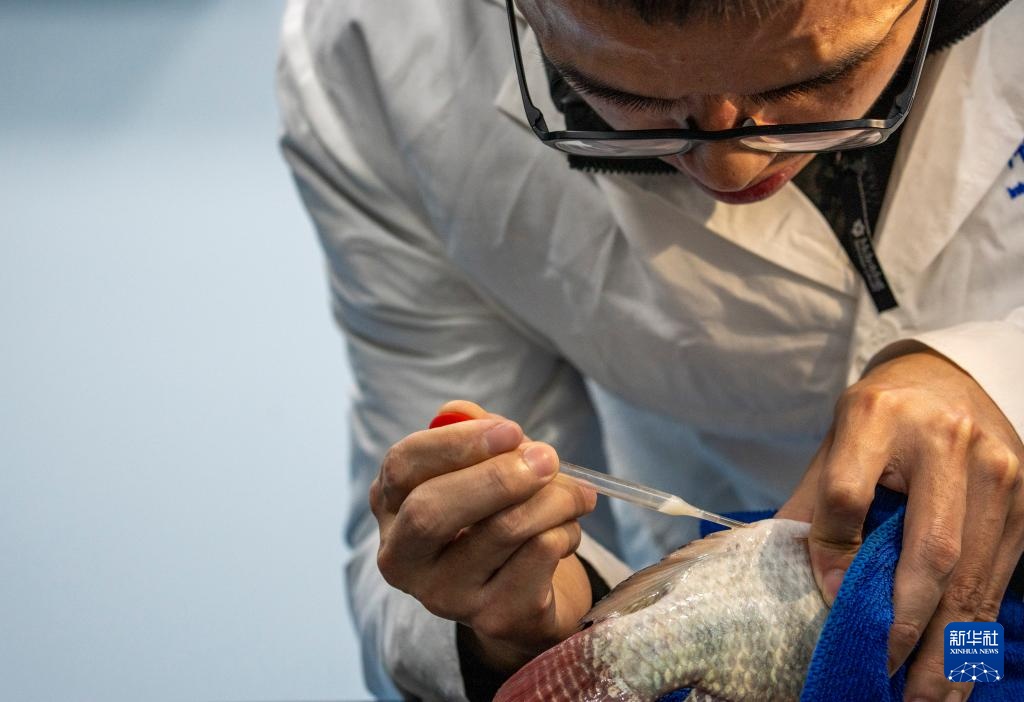 11月27日,在西部(重庆)科学城种质创制大科学中心的实验室,研究人员在为野生罗非鱼进行人工采精。