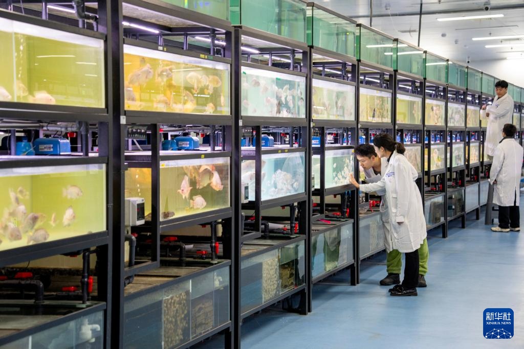 11月27日,在西部(重庆)科学城种质创制大科学中心养殖室,研究人员在观察记录新品种罗非鱼的生长情况。
