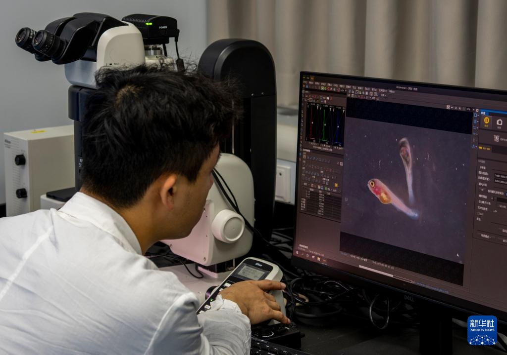 11月27日,在西部(重庆)科学城种质创制大科学中心的实验室,研究人员利用设备对新品种罗非鱼鱼苗进行表型观察。