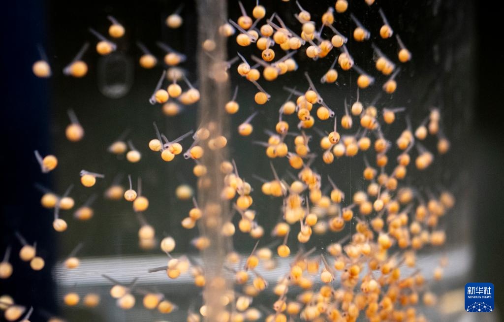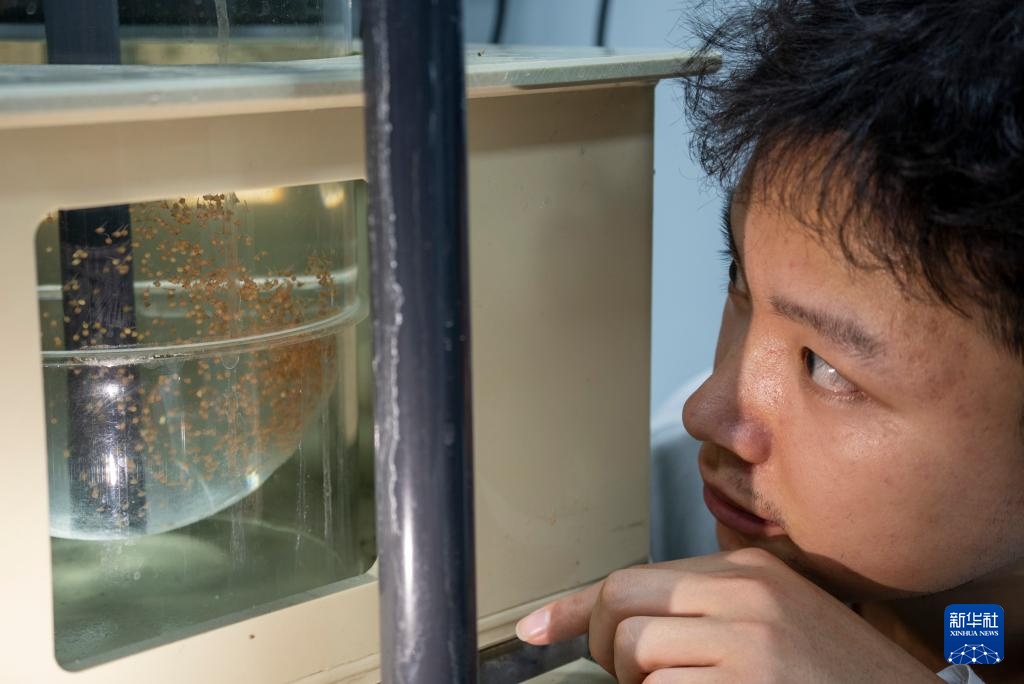 11月27日,在西部(重庆)科学城种质创制大科学中心养殖室,研究人员在观察人工孵化的新品种罗非鱼鱼苗的生长情况。