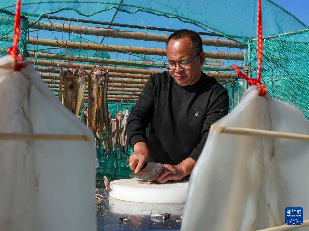 11月27日,东岙村村民陈坤球将晾晒好的油鳗干切块,准备装袋寄给客户。