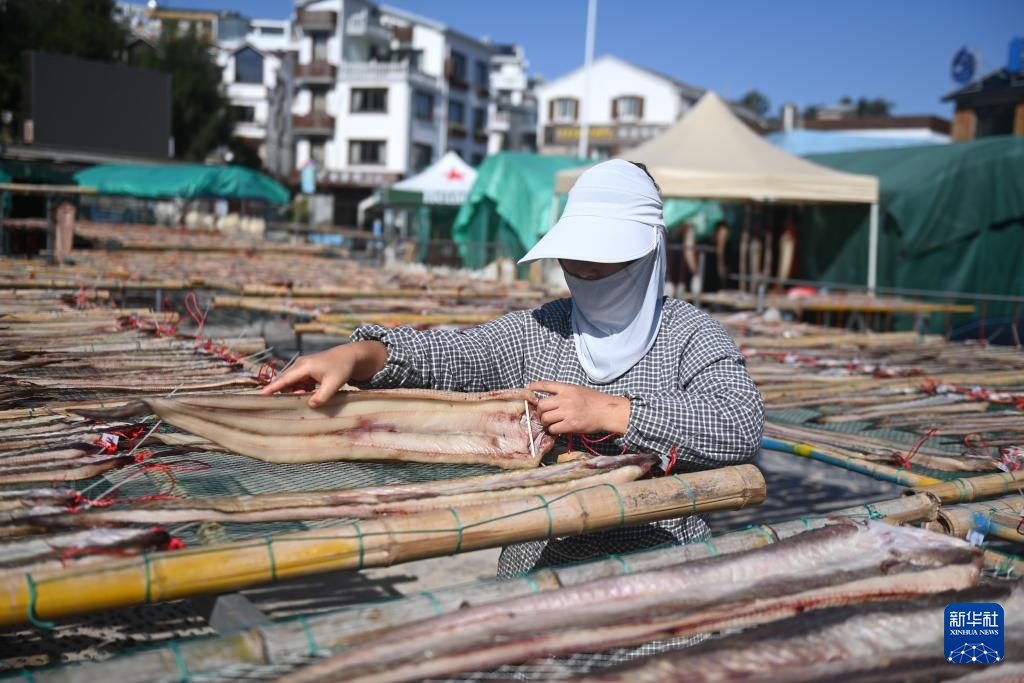 11月27日,东岙村村民在空地上晾晒油鳗。
