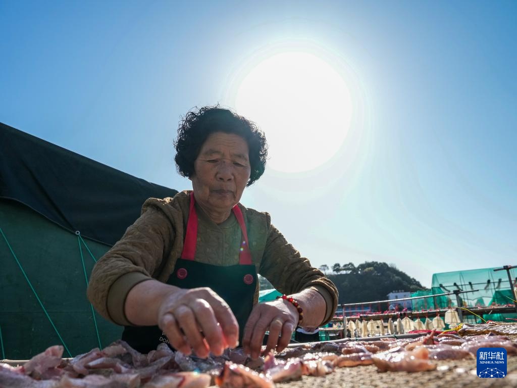 11月27日,东岙村村民在空地上晾晒海鲜。