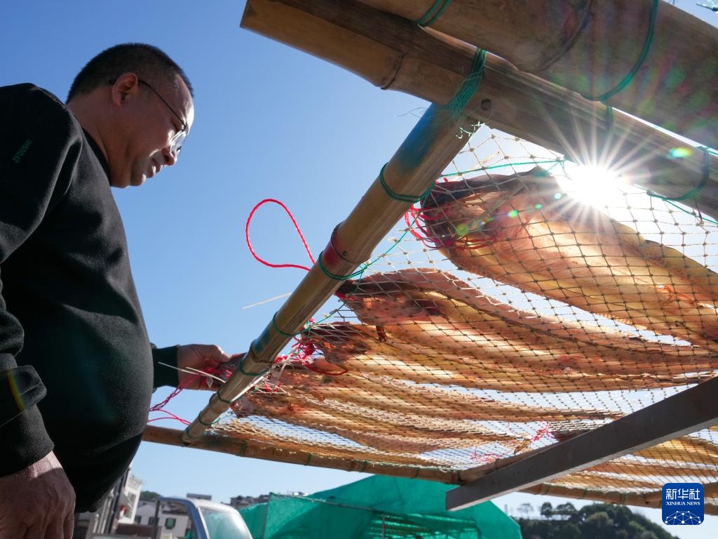11月27日,东岙村村民陈坤球在晾晒油鳗。