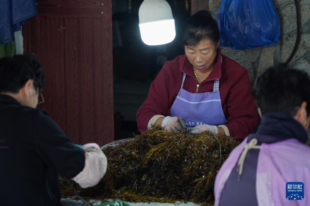 11月27日,东岙村村民将羊栖菜苗种夹在网绳上,以备送往海水养殖区域。