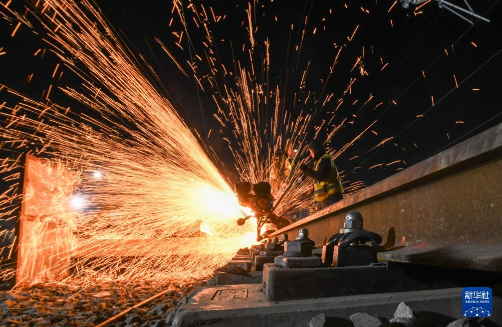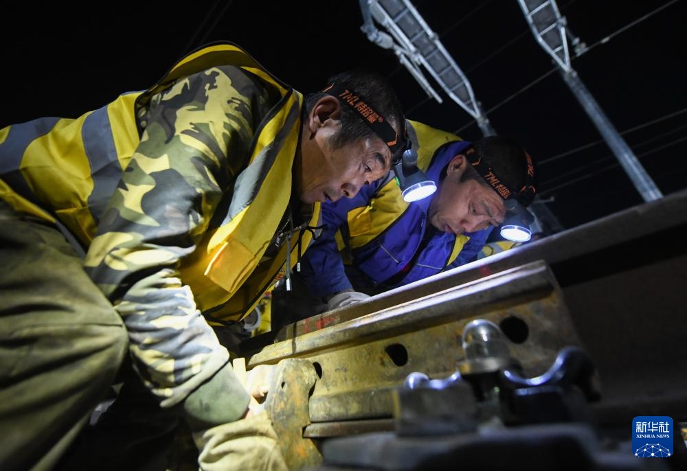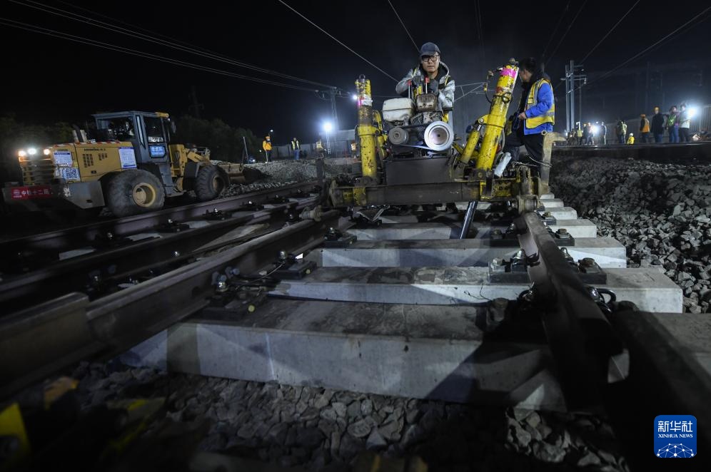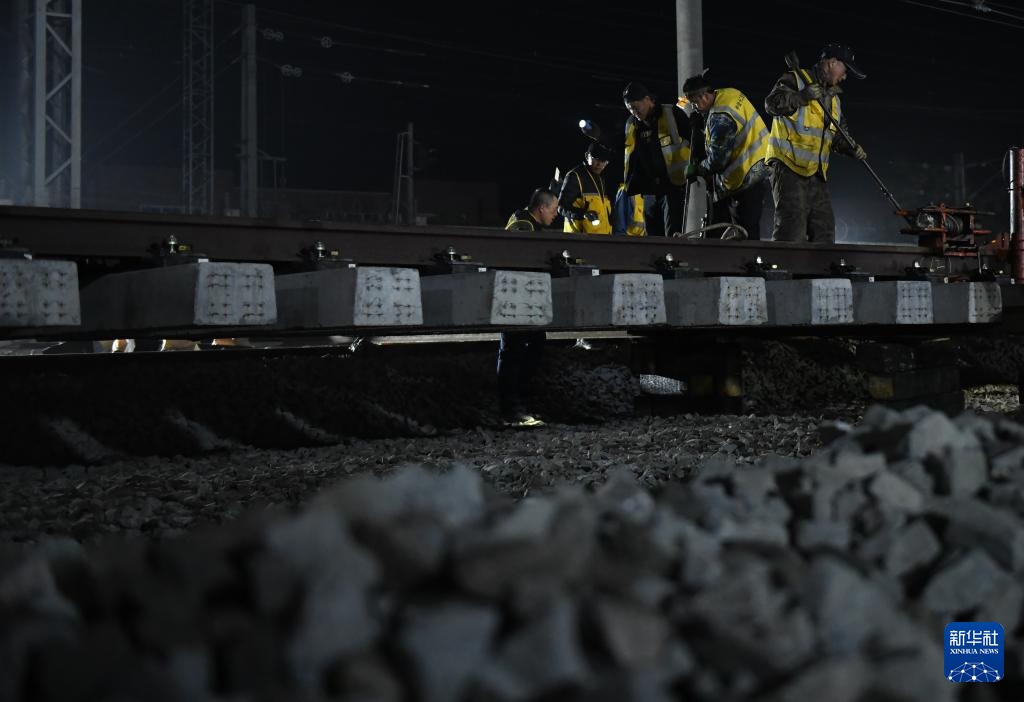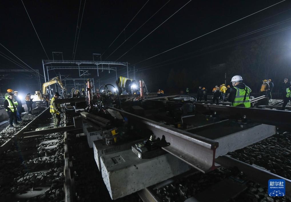 11月28日晚,工人在进行道岔插铺施工。