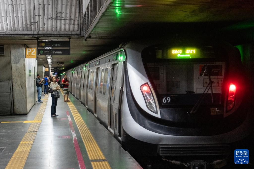11月13日,在巴西里约热内卢博塔弗戈地铁站,一辆由中车长春轨道客车股份有限公司制造的地铁列车驶入站台。
