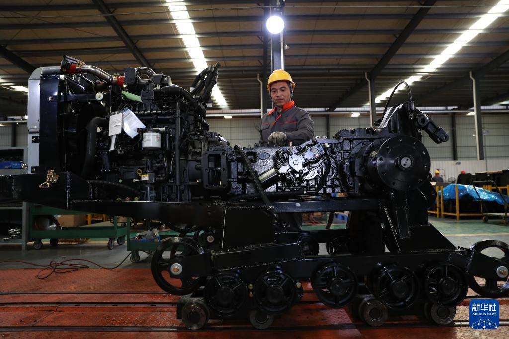 11月29日,在湖南郴州的农夫机电有限公司车间里,工人对一台履带式拖拉机成品进行调试。