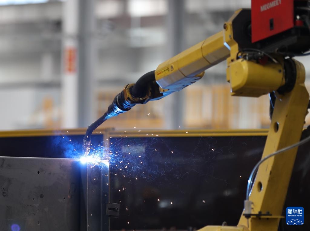 这是11月29日拍摄的湖南郴州粮油机械有限公司生产车间里的智能焊接机器人。
