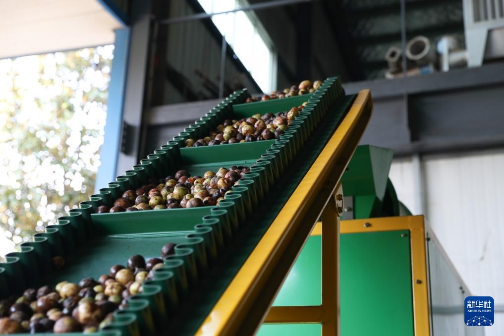11月27日,在湖南省娄底市双峰县的农友机械集团有限公司油茶林全程作业展示区,一台油茶果剥壳机在进行作业。