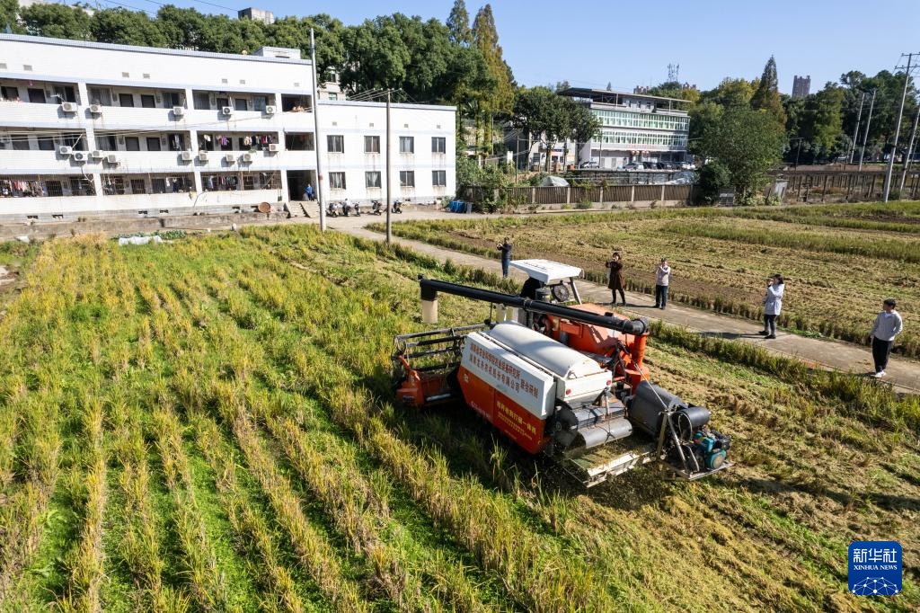 这是11月26日在湖南省农业装备研究所东湖路试验田拍摄的秸秆收割打捆一体机(无人机照片)。