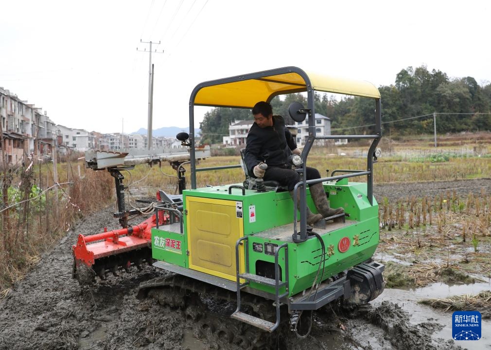 11月26日,在湖南省娄底市双峰县荷叶镇,一名农机手在驾驶旋耕机。