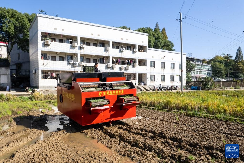 这是11月26日在湖南省农业装备研究所东湖路试验田拍摄的智能自序抛秧机(无人机照片)。