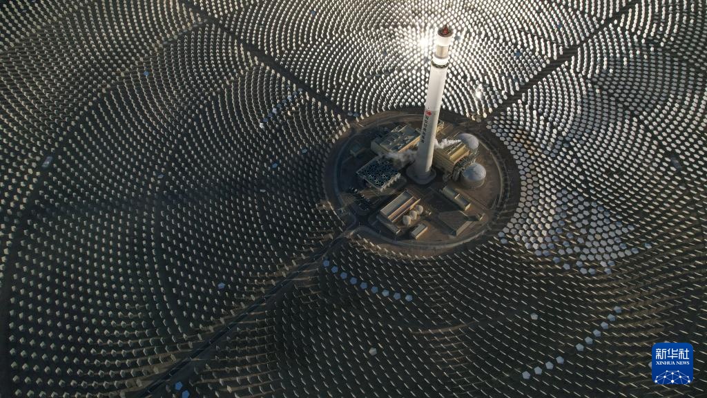 这是11月30日拍摄的并网发电的阿克塞汇东新能源光热+光伏试点项目(无人机照片)。