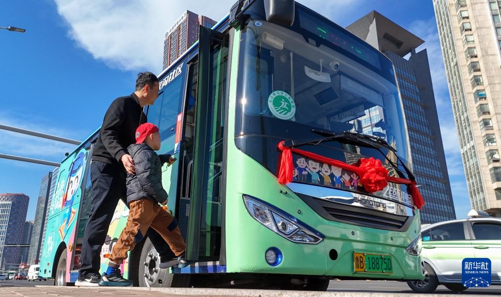 11月30日,在青岛西海岸新区家佳源车站,一对父子乘坐“邻里巴士”出行(无人机照片)。