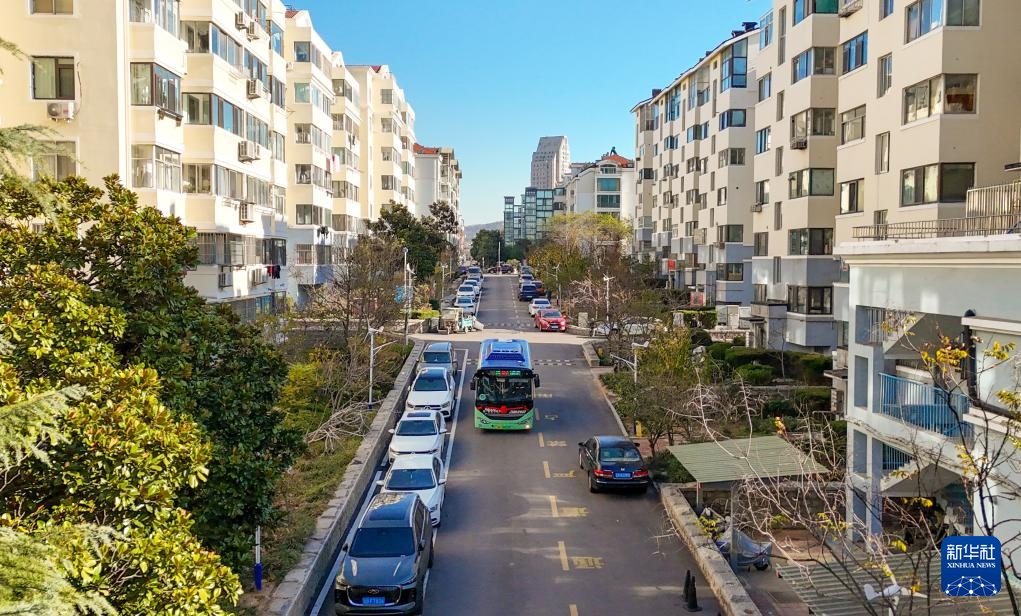 11月30日,一辆“邻里巴士”开出青岛西海岸新区孙家沟社区(无人机照片)。