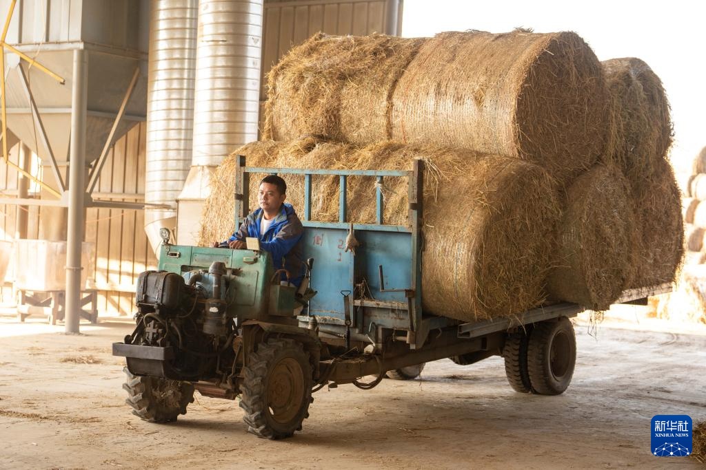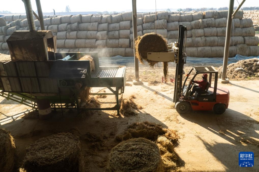12月1日,在南县浪拔湖镇太阳山村一秸秆饲料化利用工厂,工人在运输秸秆。