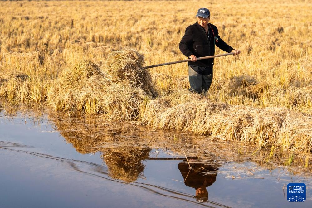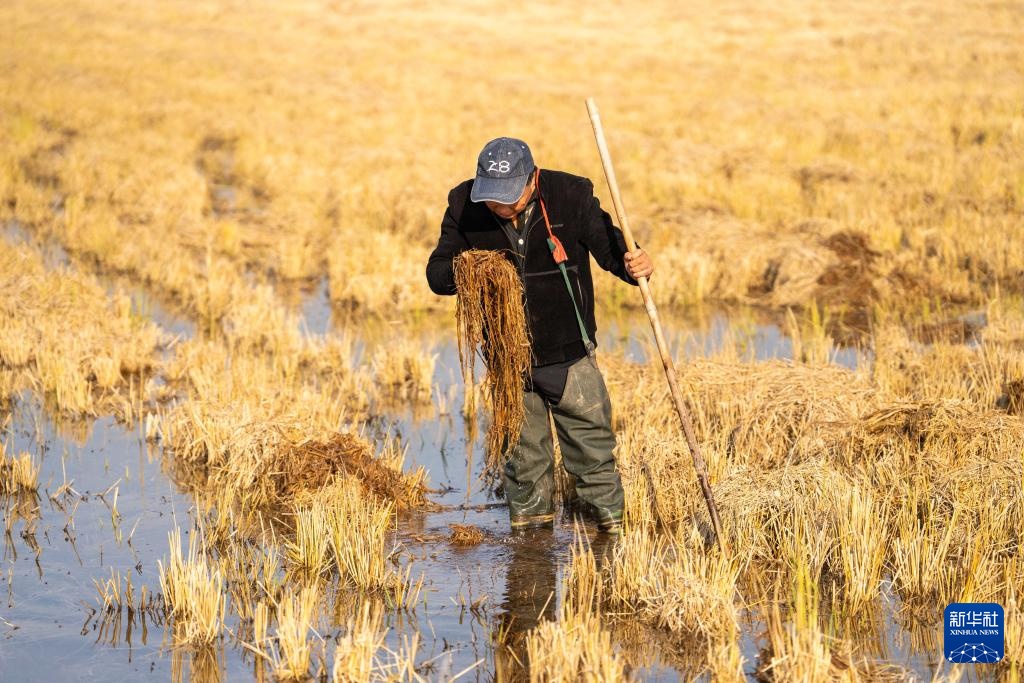 12月1日,在南县三仙湖镇三仙湖村一块稻虾田,村民翻动秸秆促进秸秆饵料化利用。