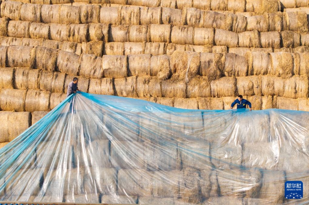 12月1日,在南县浪拔湖镇太阳山村一秸秆饲料化利用工厂,工人给秸秆覆盖防水膜(无人机照片)。