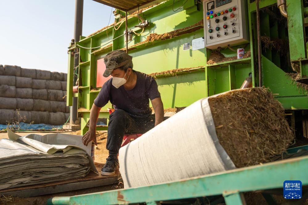 12月1日,在南县浪拔湖镇太阳山村一秸秆饲料化利用工厂,工人将秸秆制作成饲料。