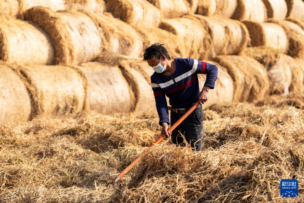 12月1日,在南县浪拔湖镇太阳山村一秸秆饲料化利用工厂,工人在晾晒秸秆。