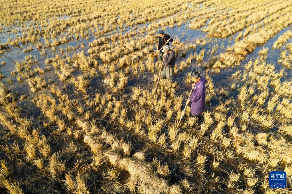 12月1日,在南县三仙湖镇三仙湖村一块稻虾田,村民翻动秸秆促进秸秆饵料化利用(无人机照片)。