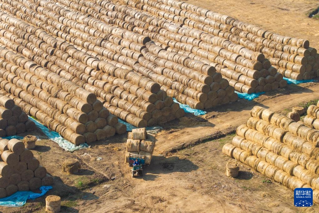12月1日,在南县浪拔湖镇太阳山村一秸秆饲料化利用工厂,工人在运输秸秆(无人机照片)。