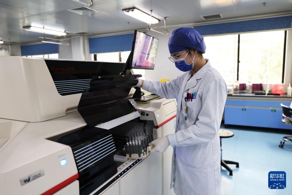 11月21日,在南宁市第四人民医院检验科免疫室,医生对待检样本进行艾滋病病毒检测。