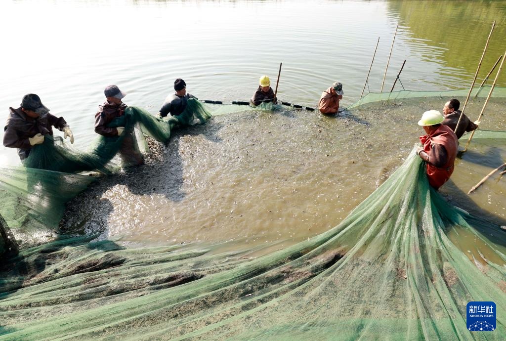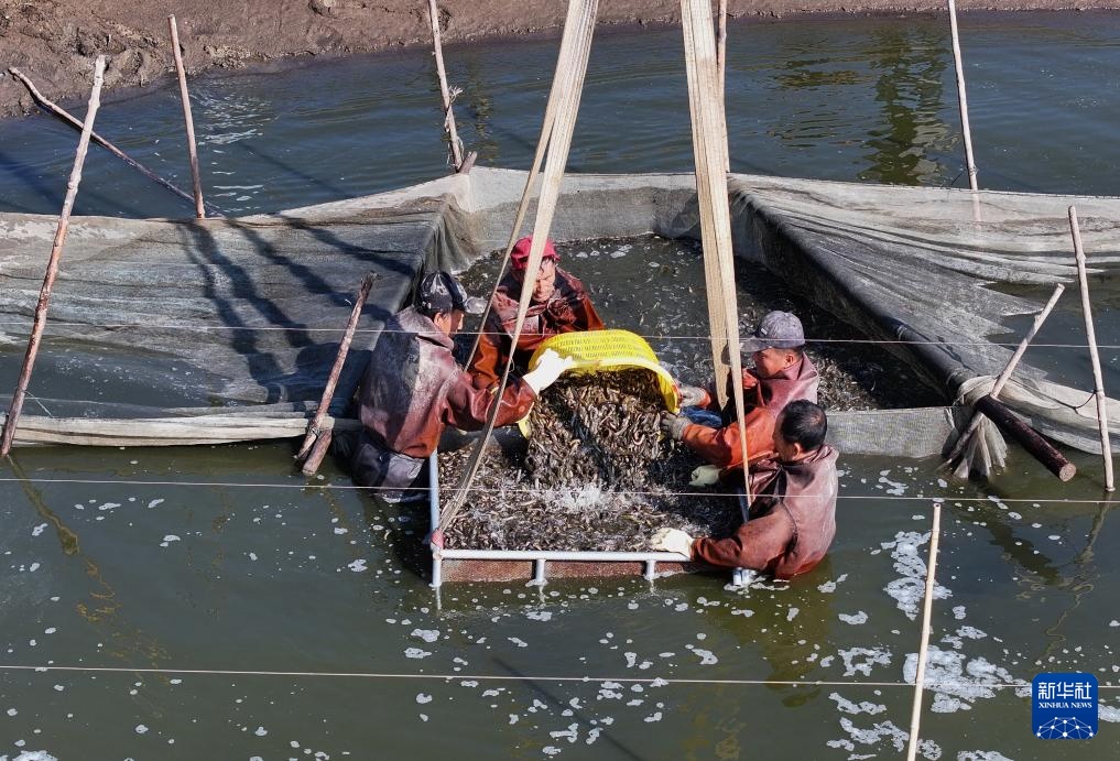 12月1日,河北省唐山市丰南区西葛镇越支五村的农民在鱼塘捕捞泥鳅。