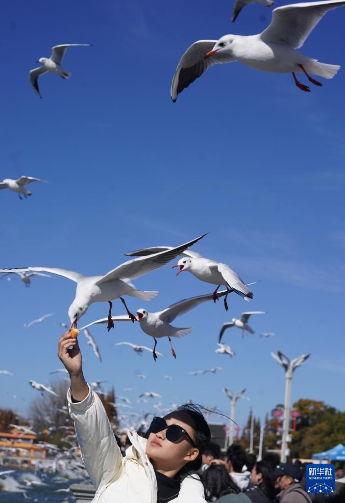 12月1日,游客在昆明滇池海埂观景大道投喂红嘴鸥。