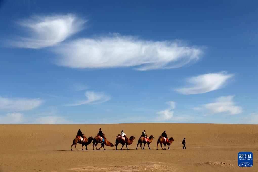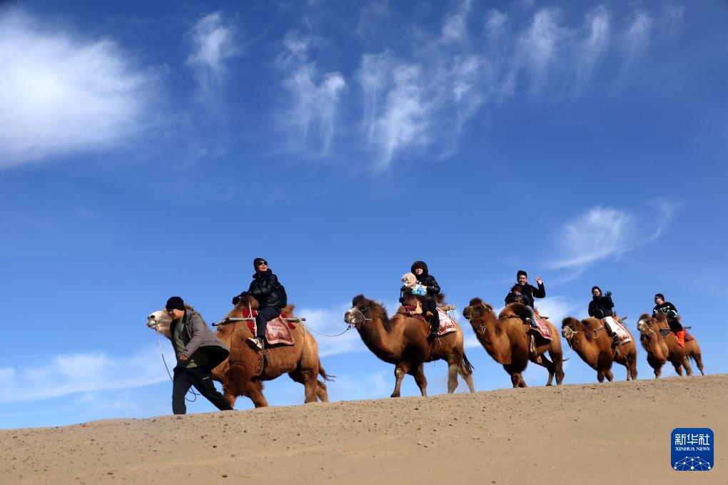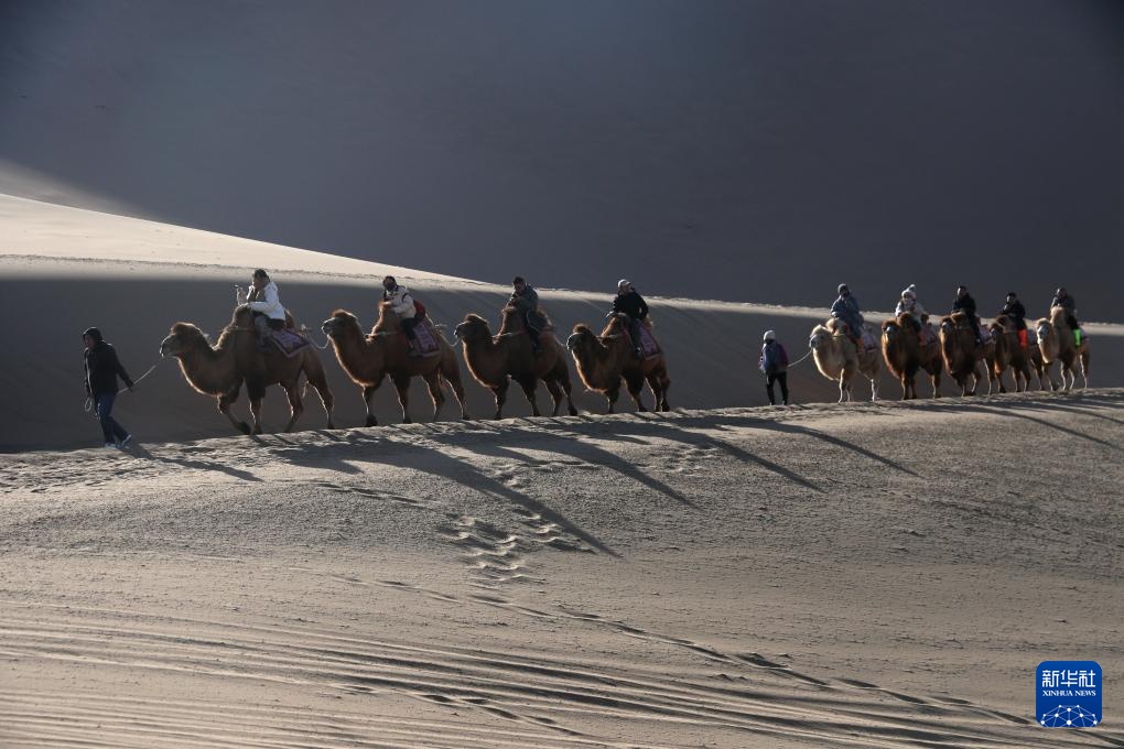 12月1日,游客在甘肃省敦煌市鸣沙山月牙泉景区骑骆驼游览。