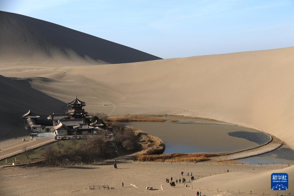 12月1日,游客在甘肃省敦煌市鸣沙山月牙泉景区游览。