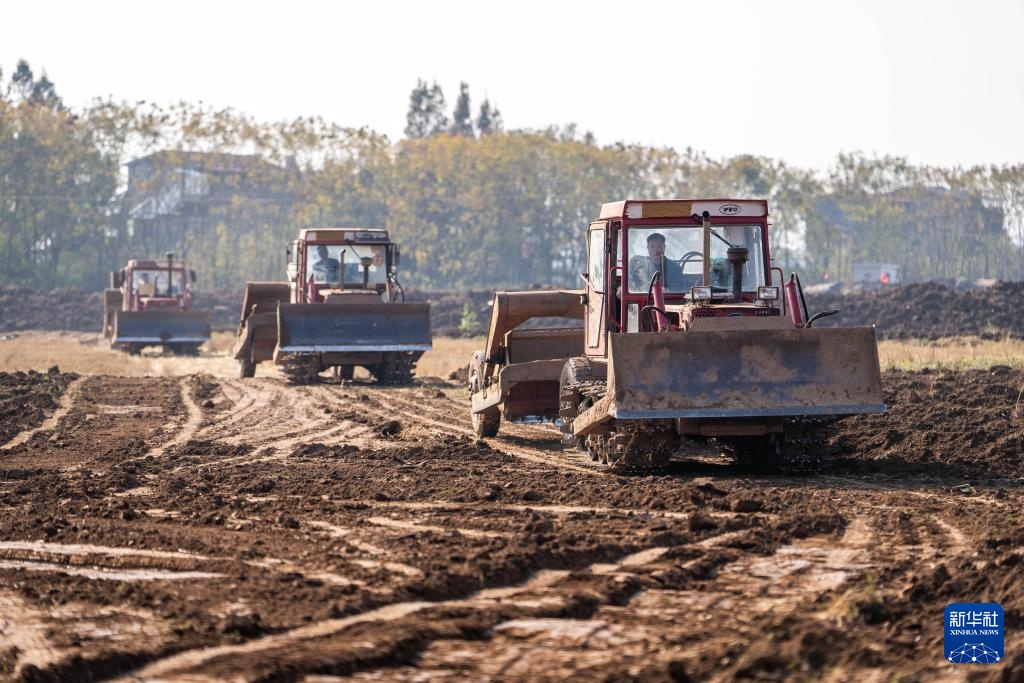 12月1日,在华阁镇光复渔村,工人驾驶机械进行高标准农田施工作业。