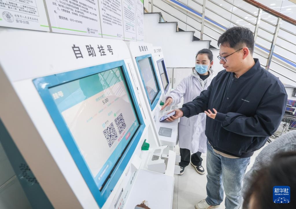 12月3日,安华镇中心卫生院的医务人员在指导患者用自助挂号机挂号。