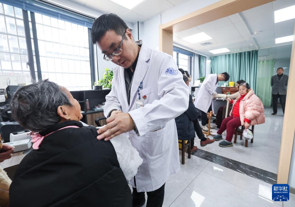 12月3日,在安华镇中心卫生院的中医骨伤科,医生给患者进行康复治疗。