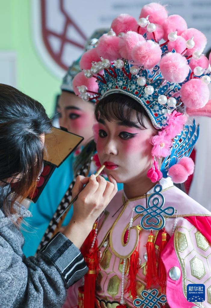 12月3日,在浙江省诸暨市西湖小学,指导老师在为越剧社团的学生演员化装。