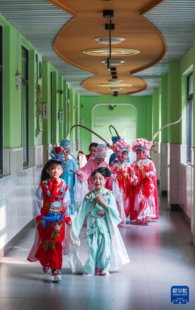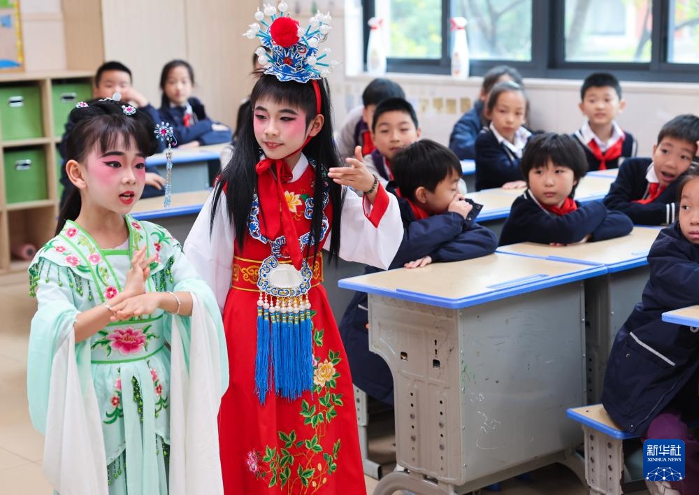 近年来,浙江省诸暨市西湖小学把地方传统戏剧越剧作为推动实现美育教育的重要方式,搭建了校园戏曲角,设立了校园戏剧主题日,自编了《西湖越韵》校本教材,把越剧课程纳入到学校日常教学中,定期邀请当地非遗中心戏曲名角来校授课,并通过“戏剧+”融合式课程和活动模式创新,让师生共同参与戏剧创演、戏帽制作、脸谱描绘、戏曲人物3D设计,营造浓厚的戏剧文化氛围。