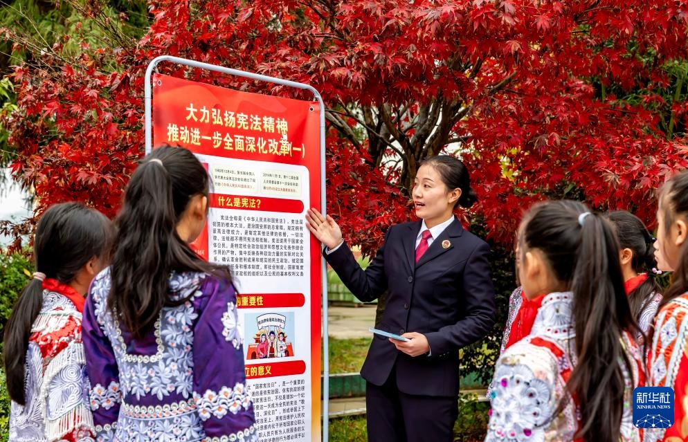 12月3日,贵州省铜仁市玉屏侗族自治县人民检察院的检察干警在玉屏侗族自治县第二小学给学生普及宪法知识。