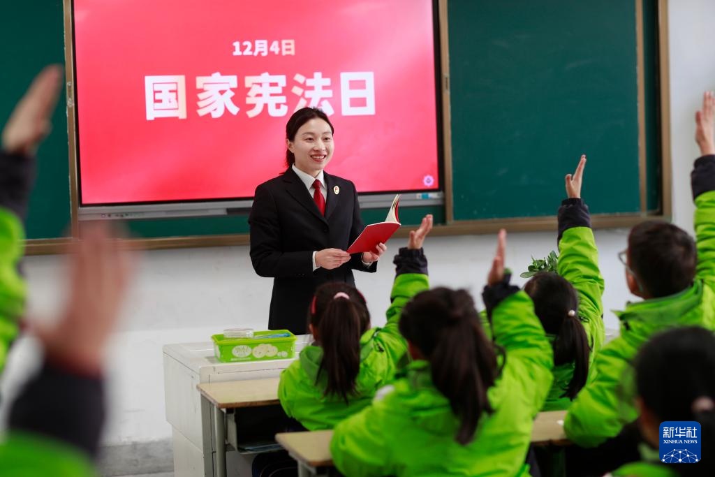12月3日,在四川省达州市通川区罗江镇魏兴实验学校,普法志愿者给学生讲解宪法知识。