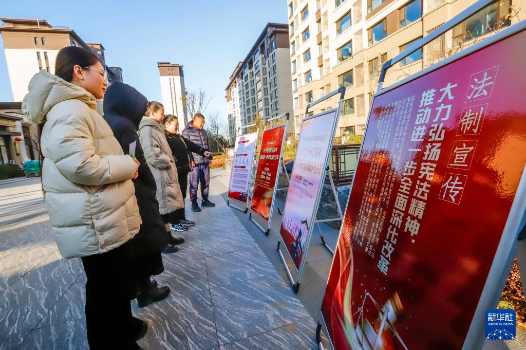 12月3日,河北省遵化市华明路街道的社区居民在参观宪法知识宣传展板。