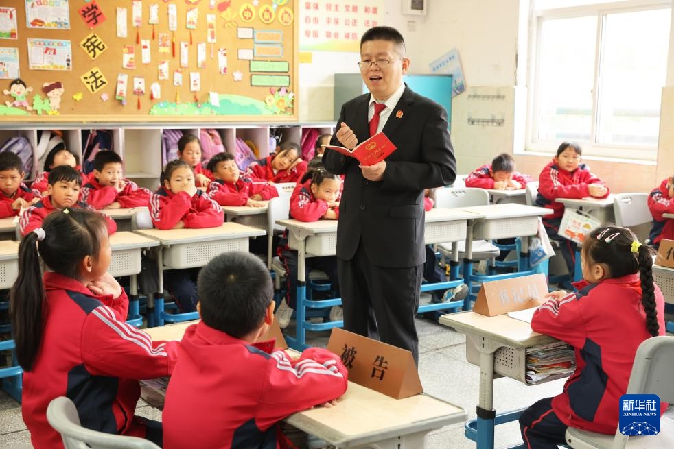 12月3日,在浙江省湖州市德清县乾元镇中心小学的模拟法庭上,法官为学生们讲解宪法知识。