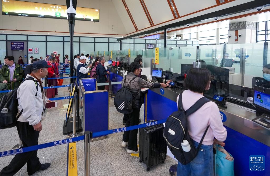12月3日,旅客在中老铁路磨憨站内的出境联检大厅排队办手续。