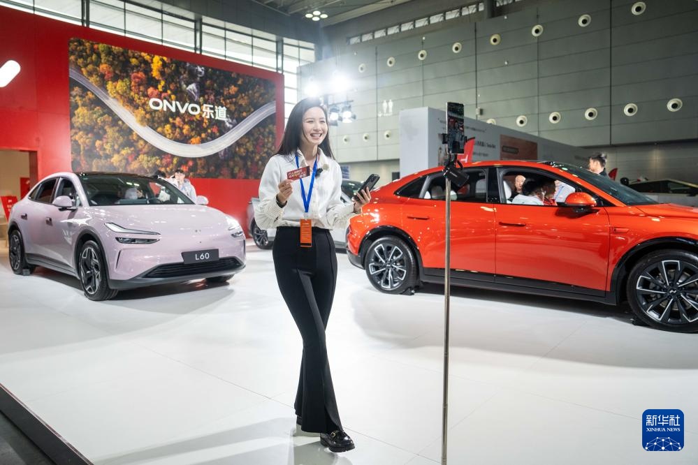 12月4日,在长沙国际会展中心,一名网络主播在介绍展车。