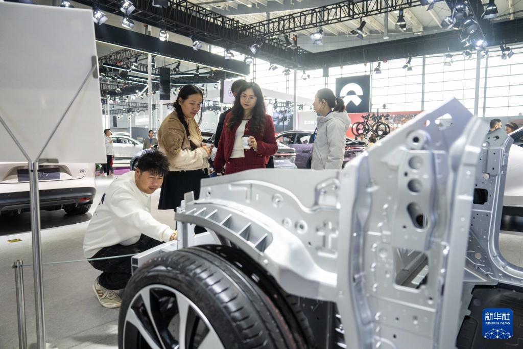 12月4日,在长沙国际会展中心,观众(左一)在观看汽车结构模型。